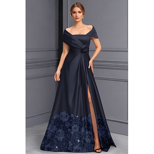 Linea ad A Lunghezza al pavimento Abito da Sera Abito da ballo con sopragonna Abito formale Elegante Spacco Alto Manica Corta Senza Spalle Matrimonio Formale Raso con Glitter Arricciato Cristalli
