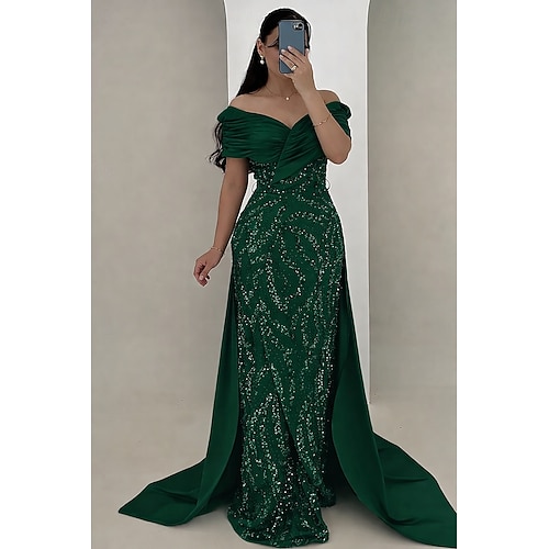 Linea ad A Lunghezza al pavimento Abiti da Ballo Elegante Manica Corta Senza Spalle Natale Formale Con Paillettes Senza schiena con Pieghe