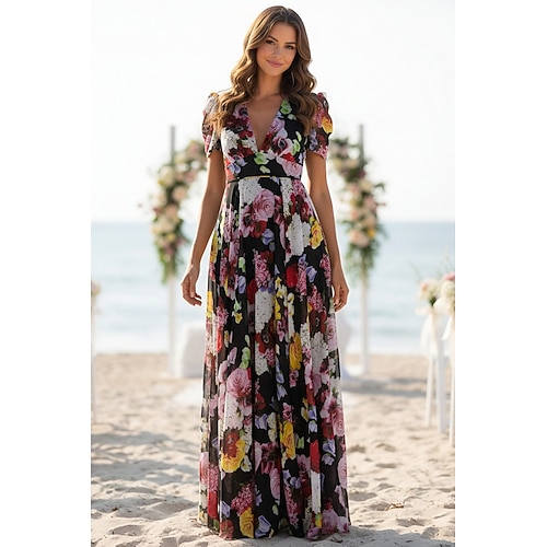 Linea ad A Lunghezza al pavimento Abito da cerimonia per signora Manica Corta Scollo a V Elegante Formale Ospite di nozze Chiffon con Blocco di Colore