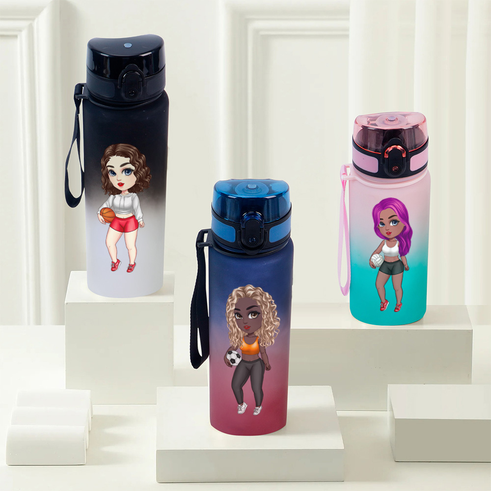 Personlig Gradient Cartoon Basketball Volleyball Soccer Girl Läckagesäker namnvattenflaska med flip-top lock och rem Present för gymsportälskare