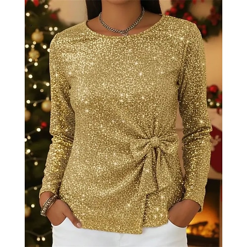 Natale Per donna Blusa Top Eleganti Top con paillettes Semplice Elegante Vintage Quotidiano Manica Lunga Girocollo Top Regolari Lavoro Quotidiano Ferie Arricciato Paillettes Patchwork Blu Argento