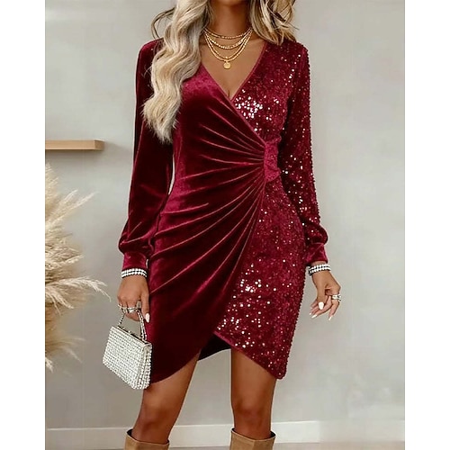 Per donna Mini Abito Abito in Velluto Abito con Paillettes Tubino Moda Caldo Moderno Quotidiano Vacanza Uscire Vestibilità regolare Semplice Manica Lunga Scollo a V Blu Nero Borgogna Oro Primavera