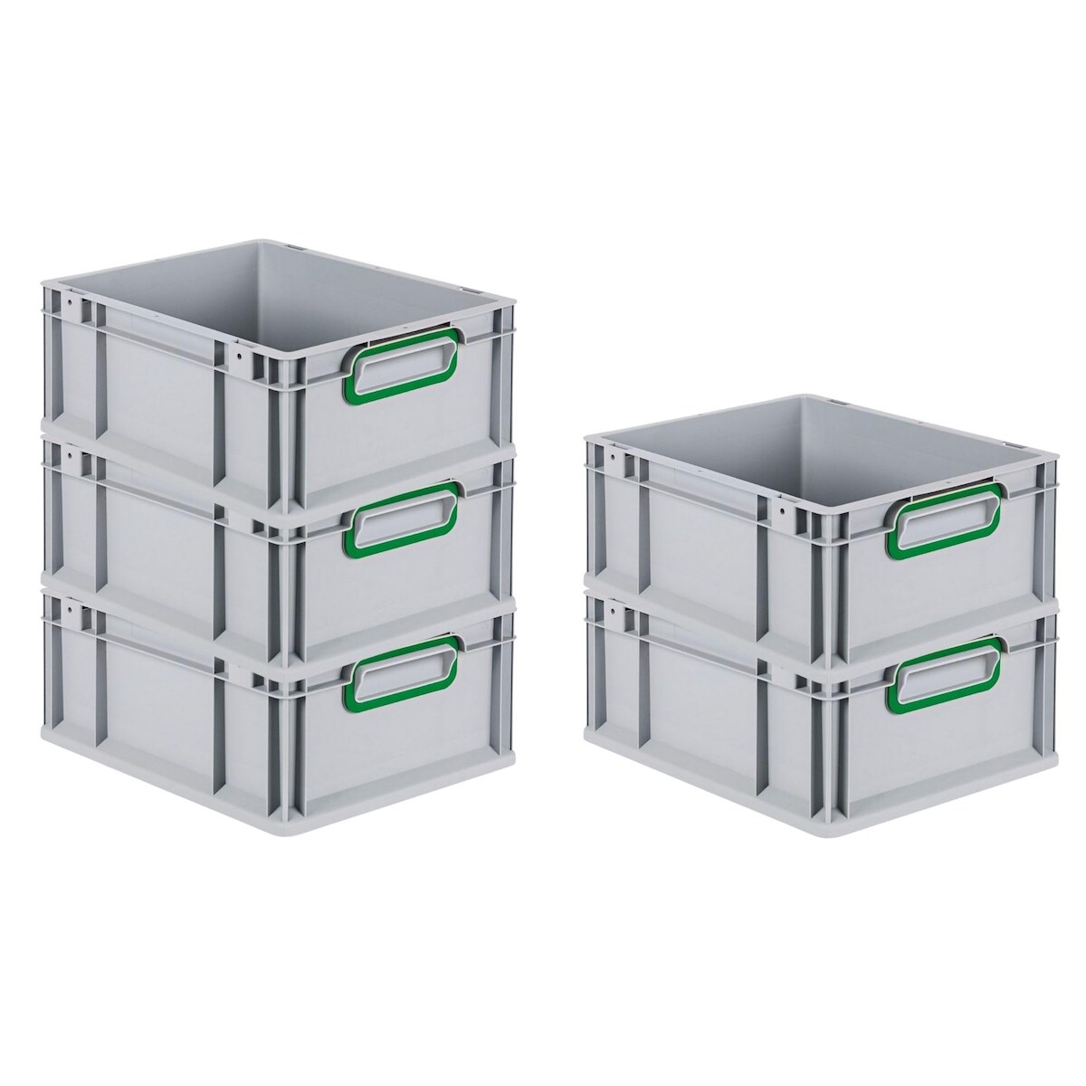 PROREGAL SparSet 5x Eurobox NextGen Color, HxBxT 17x30x40cm, 16 Liter, Griffe grün zu, Grau, Eurobehälter, Box, Transportbehälter