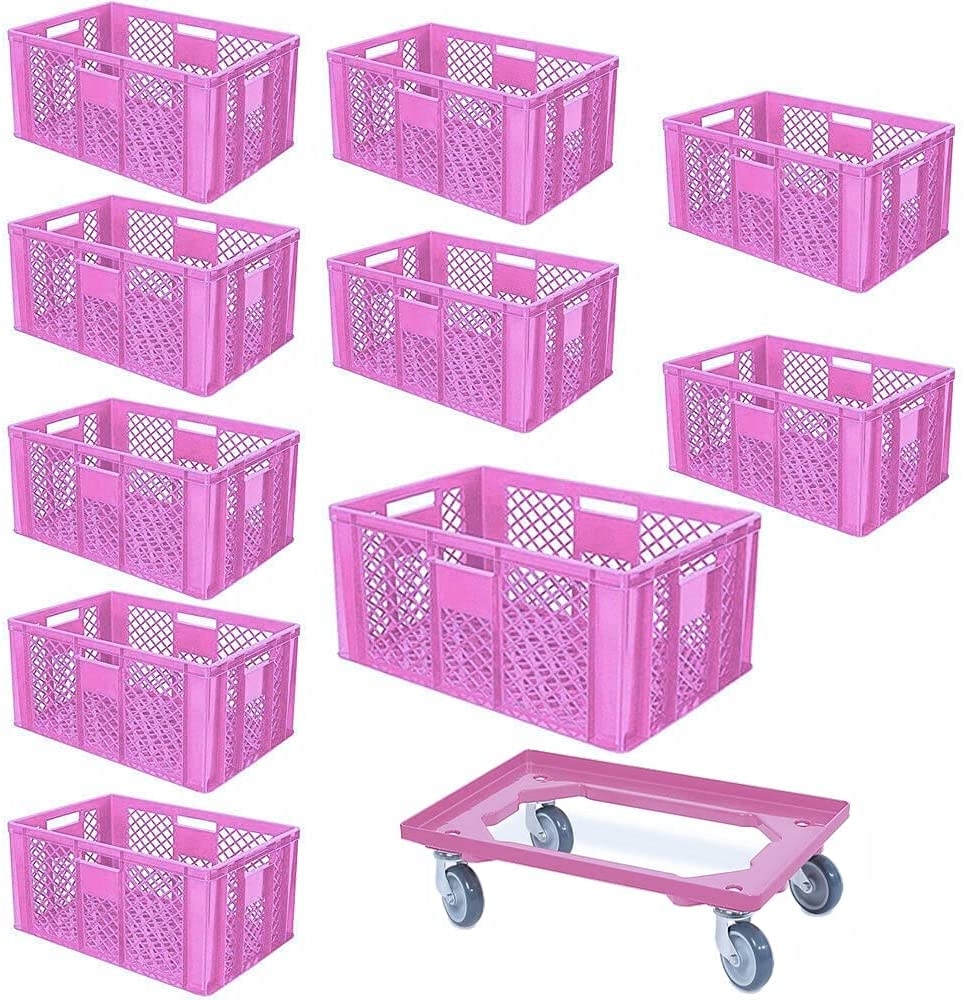 BRB 10 Eurobehälter, LxBxH 600x400x320 mm, lebensmittelecht + 1 Transportroller, pink
