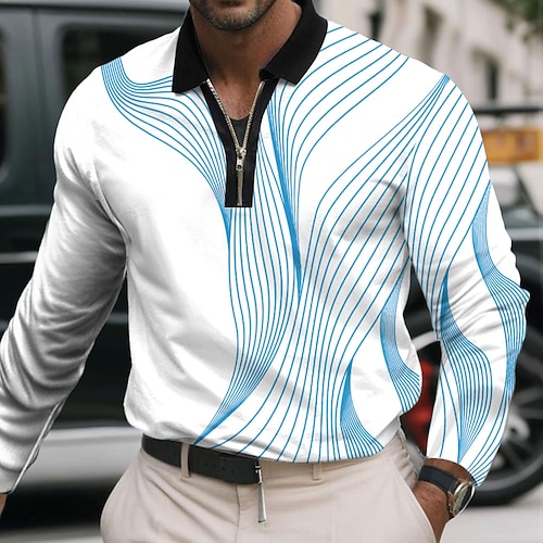 Per uomo Geometrico Linea Polo Manica Lunga Magliette polo Bavero Business Casual Athleisure Abbigliamento quotidiano Stampa 3D Polo con cerniera a un quarto Primavera Autunno Inverno Nero Bianco Blu
