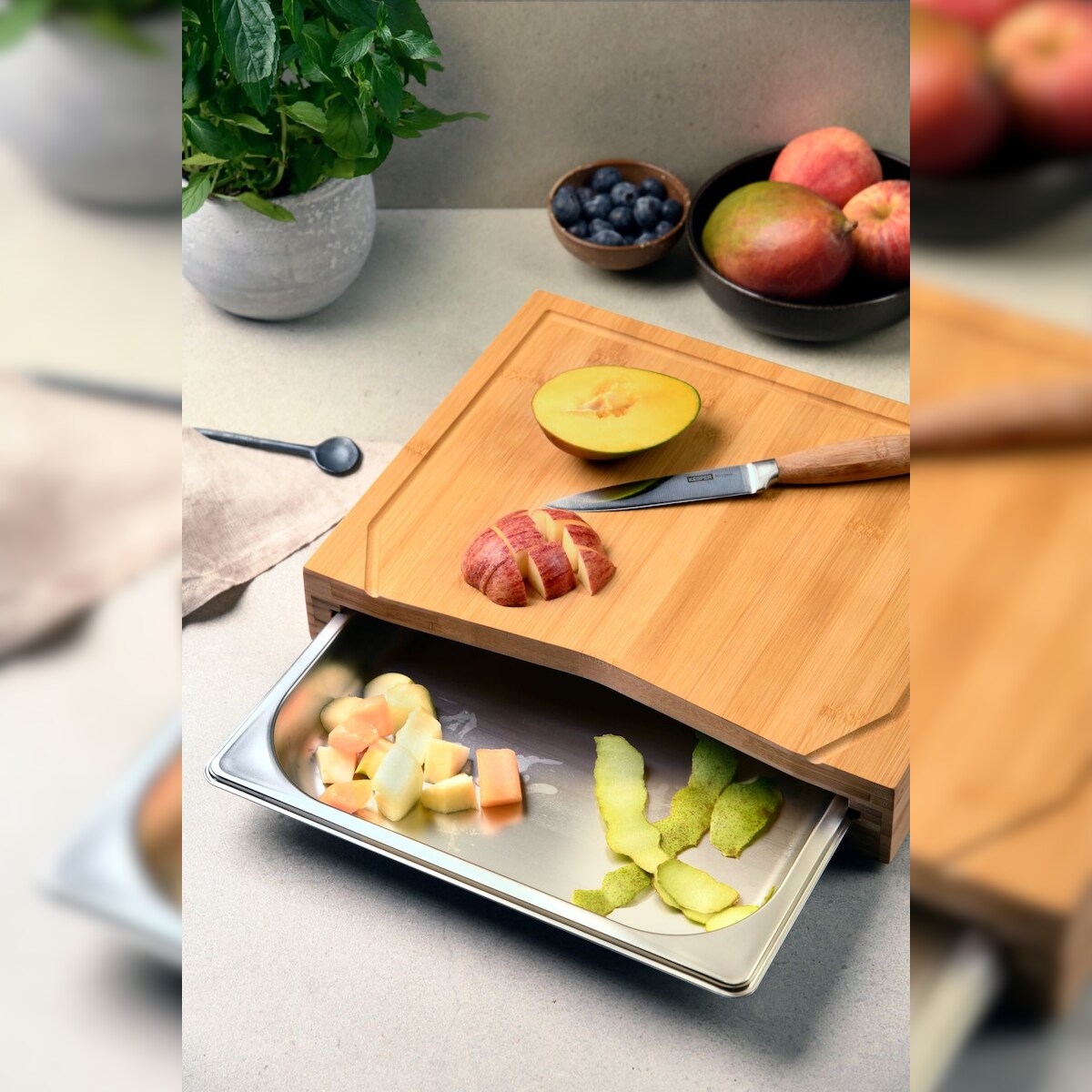 Gravidus Bambus Schneidebrett mit Edelstahl Auffangschale Saftrille Rutschfest