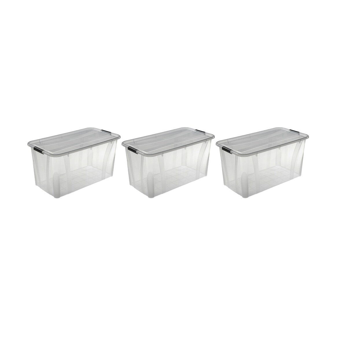 3 Stück Aufbewahrungsbox transparent 60 Liter mit Deckel und Klickverschluss 610 x 450 x 360 mm inkl. Rollen