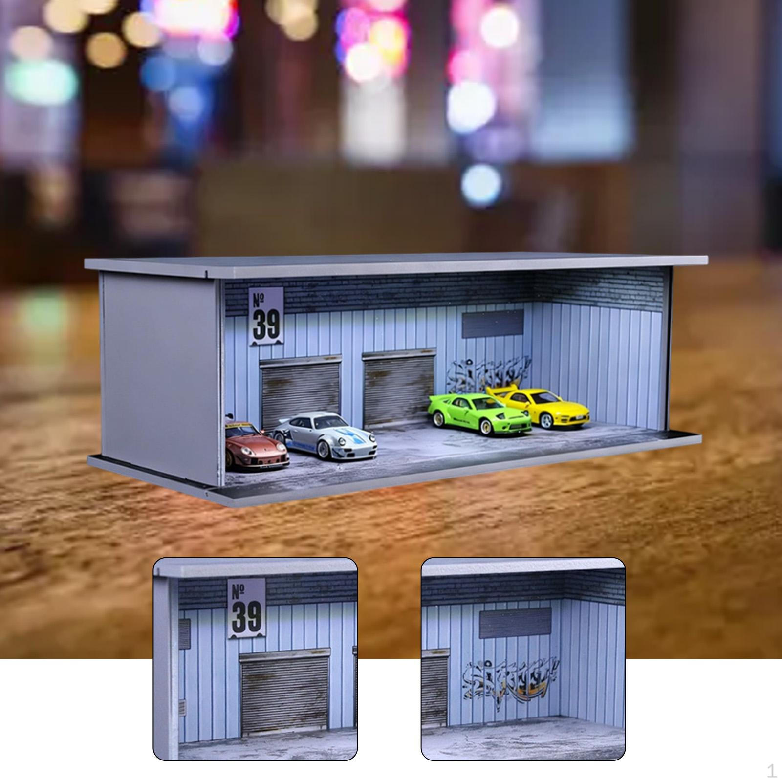 1:64 Garagenvitrine mit Acryl-Schiebetür und LED-Beleuchtung, realistische Szenen-Vitrine, Diorama für