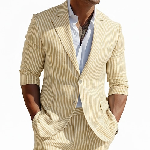 Uomo Casuale Matrimonio in Spiaggia Abiti in seersucker Bavero classico Giallo Rosa Leggero Casual A righe Vestibilità su misura 2 pezzi Monopetto Due Bottoni
