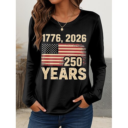 T-shirt grafica per il 250° Giorno dell'Indipendenza delle Donne Americane bandiera stilosa e casual maniche lunghe collo rotondo top regolari stampa quotidiana bianca khaki primavera autunno