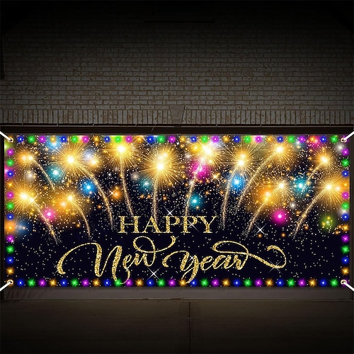 Capodanno arazzo Copertura per porta del garage Grande appeso Buon anno 2026 Fuochi d'artificio Carino 3D Da serata All'aperto Vacanze Sfondi di ripresa Yarda Arredamento per la casa