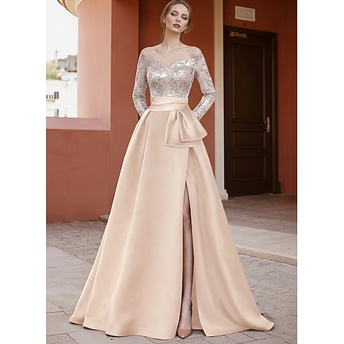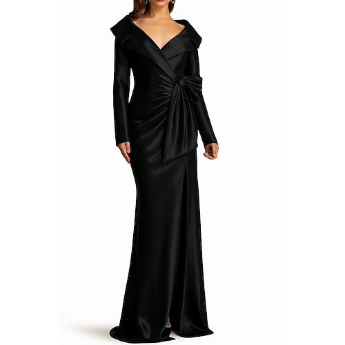 Linea ad A Tubino Colonna Lunghezza al pavimento Abiti da Ballo Abito da Sera Da principessa Abito formale Elegante Scintillante Setoso Manica Lunga Bavero Matrimonio Formale Tasca Raso Raso