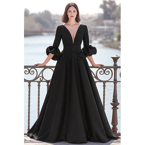 Linea ad A Lunghezza al pavimento Abito da Sera Da principessa Abito formale Elegante Spacco Alto Setoso Manica 3/4 Scollo Illusione Matrimonio Formale Tasca Raso Pizzo con Tasca