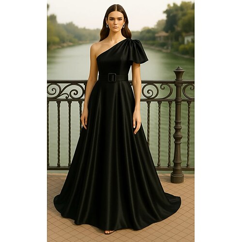 Linea ad A Lunghezza al pavimento Abito da Sera Da principessa Abito formale Elegante Setoso Manica Corta Monospalla Festa in giardino Matrimonio Tasca Raso Raso Elasticizzato con Arricciato Volant