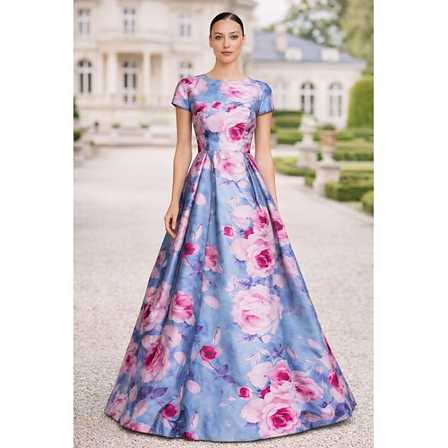 Linea ad A Lunghezza al pavimento Da principessa Abito formale Elegante Floreale Manica Corta Girocollo Festa in giardino Matrimonio Tasca Raso con Stampa floreale Tasca