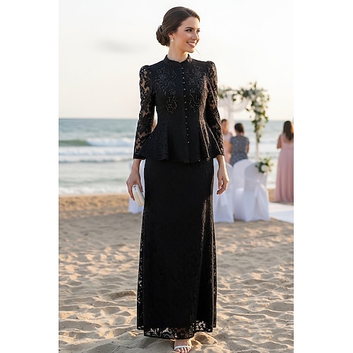 Due Pezzi Linea ad A Lunghezza al pavimento Abito da invitata a nozze Abiti per invitati a matrimoni Elegante Vintage Manica Lunga Collo Alto Festa in giardino Matrimonio con Pizzo