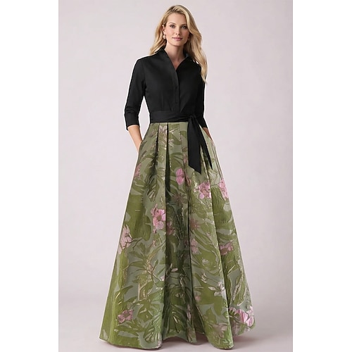 Linea ad A Lunghezza al pavimento Abito Camicia Abito da invitata a nozze Abito Formale Abito da cerimonia per signora Manica Lunga Colletto a Camicia Elegante Vintage Matrimonio Formale Nylon con
