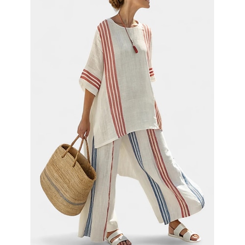 Completi di Pantaloni in Lino Sintetico Simile al Cotone per Donna Top Bolero Manica 3/4 Collo Rotondo a Strisce Moda Streetwear Casual Quotidiano Esterno Blu Nero Arancione Estate Vestibilità