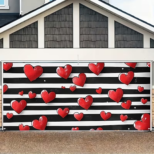 Copertura per porta da garage per San Valentino, strisce bianche e nere con cuore rosso, elegante decorazione natalizia, perfetta per vetrine o case, decorazione per garage per San Valentino