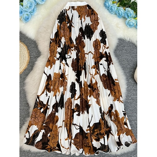 Per donna Vintage Moda Casual Maxi Vita Alta Gonne Floreale Pieghettato Stampato Micro-elastico Quotidiano Data Blu Nero Bianco Rosso Estate Poliestere