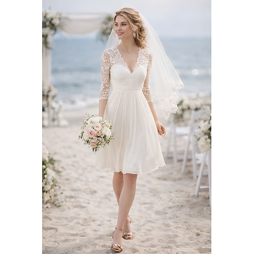 Linea ad A Lunghezza al ginocchio Abiti da sposa Abito da sposa Schiena Scoperta Piccoli Abiti Bianchi Manica 3/4 Scollo a V Laurea Compleanno Chiffon Pizzo con Arricciato