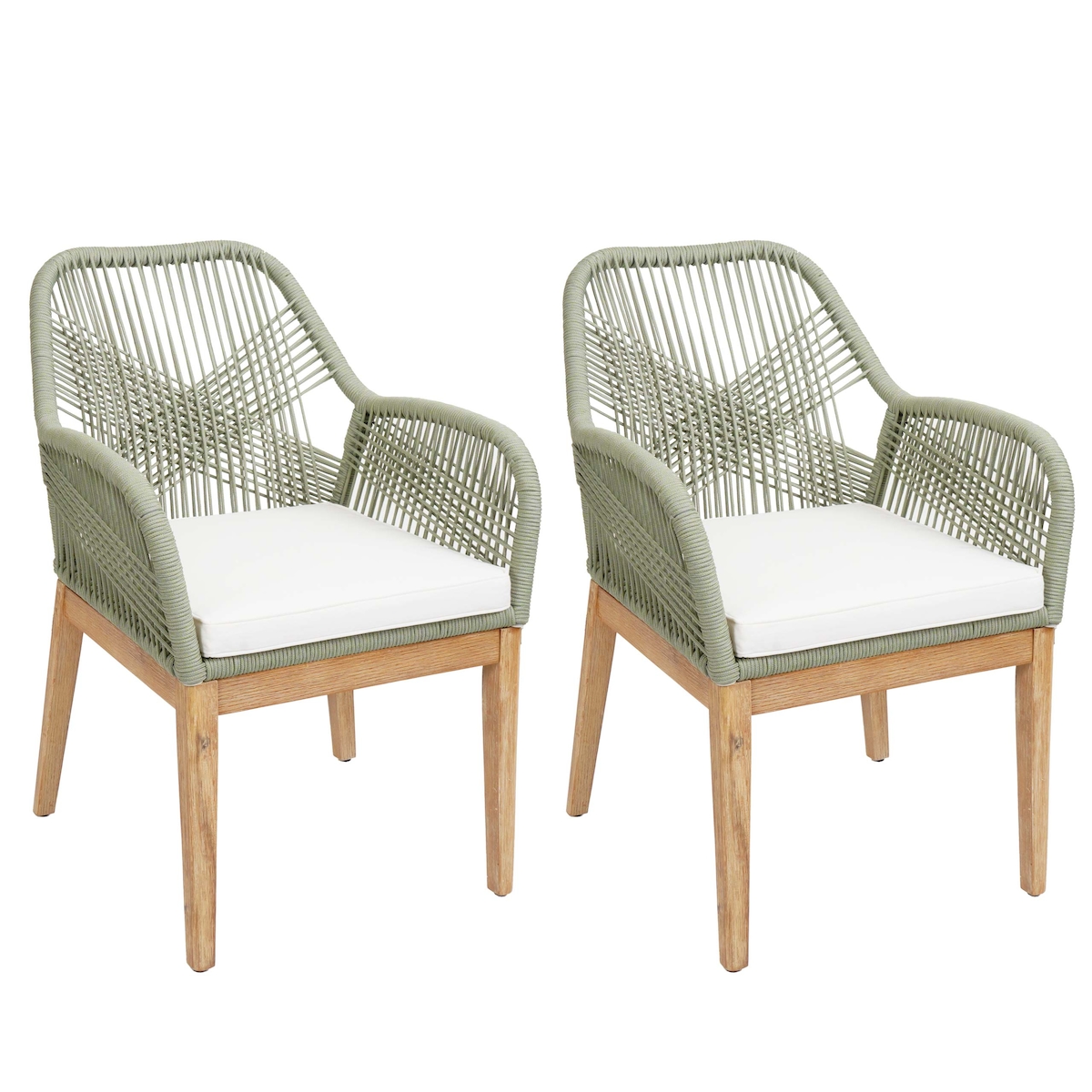 Mendler 2er-Set Gartenstuhl HWC-H56b, Sessel Outdoor, wetterfest Seilgeflecht Rope Holz Akazie ~ grün Kissen creme