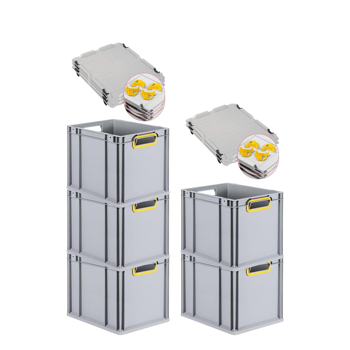 PROREGAL SparSet 5x Eurobox NextGen Color mit Auflagedeckel & Verschlüsse, HxBxT 32x40x60cm, 65L, Grau, Griffe gelb offen, Eurobehälter, Box