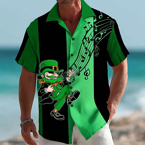 Camicia da uomo del giorno di San Patrizio Camicia con note musicali trifoglio Camicia con colletto cubano Maniche corte Stile vintage retrò All'aperto Festa Estate Primavera Colletto da campeggio