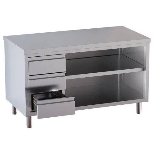 VM Europa Edelstahl Arbeitsschrank, 3 Schubladen links, mit Zwischenboden - alle Größen montiert: 160 x 60 cm / ohne Aufkantung / fertig montiert