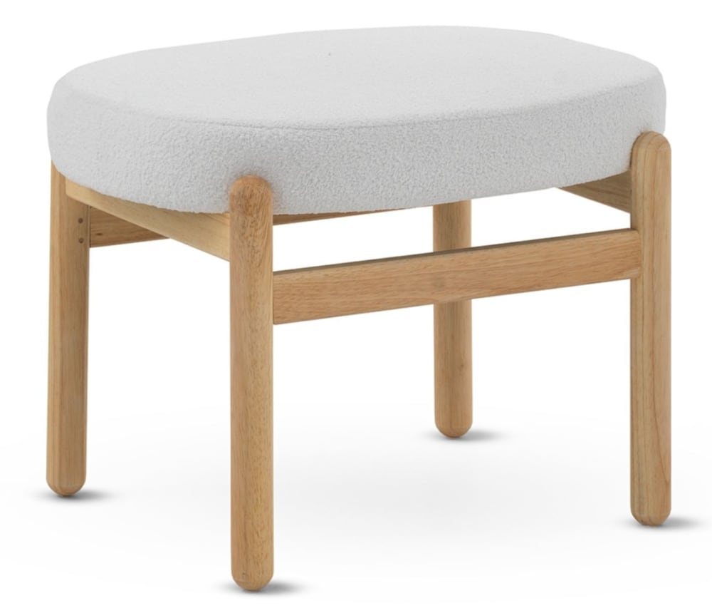Pouf tapissé en boucle blanche avec structure et pieds en pin naturel