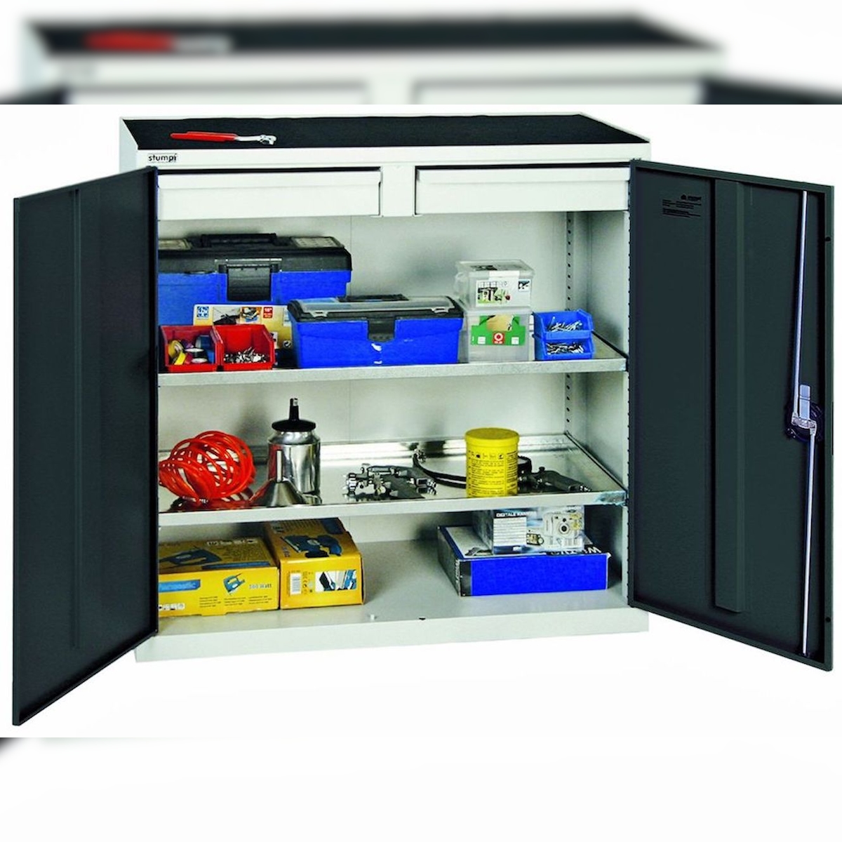 PROREGAL Werkzeugschrank mit 2 Türen, HxBxT 100x100x50cm, 2 Schubladen & 2 Fachböden, Lichtgrau/Anthrazitgrau, Lagerschrank Metallschrank