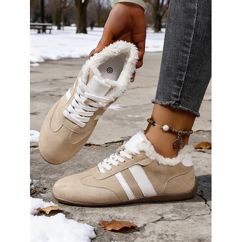 sneakers marroni da donna con strisce bianche e fodera pelosa: scarpe casual e comode per gli sport invernali, l'uso quotidiano e le avventure all'aria aperta