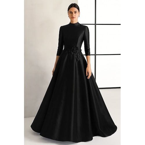 Linea ad A Lunghezza al pavimento Abito da Sera Da principessa Abito formale Elegante Scintillante Setoso Manica Lunga Collo Alto Matrimonio Formale Tasca Raso con Pieghe Tasca