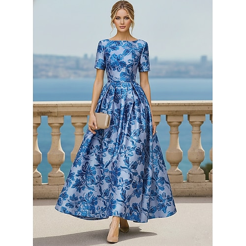 Linea ad A Lunghezza al pavimento Abiti da Cocktail Elegante Vintage Floreale Manica Corta Girocollo Festa in giardino Matrimonio Tasca Jacquard con Stampa floreale Pieghe Tasca