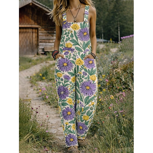 Per donna Salopette Attivo Floreale Senza Maniche Senza maniche Gamba larga Collo quadrato Tasca con tasca Quotidiano Spiaggia Vestibilità comoda Giallo Rosa Viola Estate