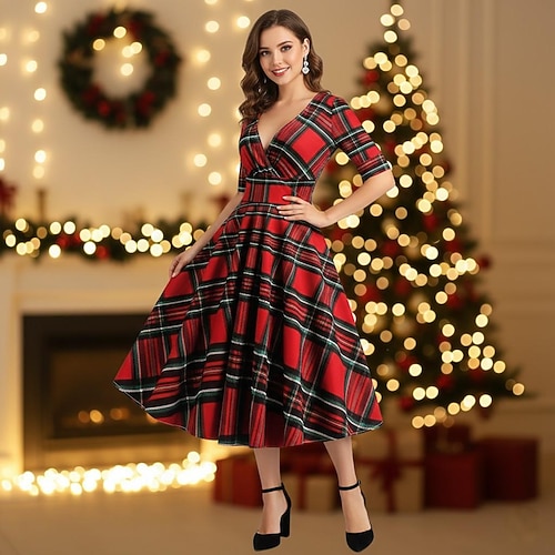 Retrò Vintage Anni 1950 Abito da cocktail Midi Abito Swing Vestito Svasato Abito per Festa di Natale Check tartan Costume Per donna Natale Carnevale Mascherata Evento / Festa Festa a tema retr