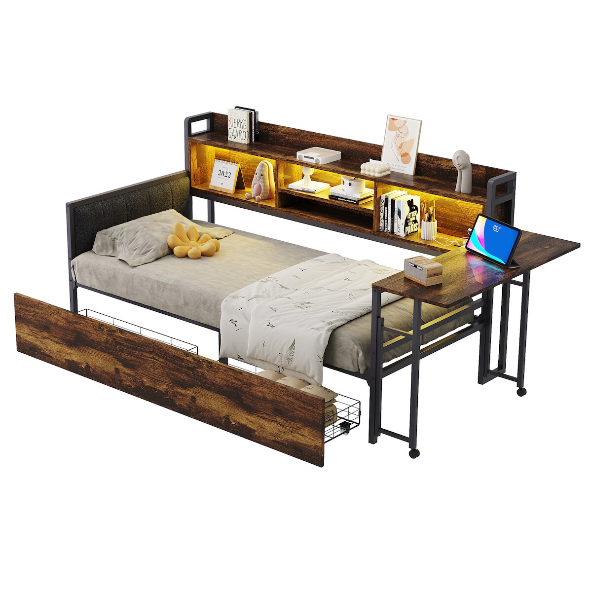 OKWISH Multifunktions-Schlafsofa 90x200 cm mit Stauraum, LED, ausziehbarem Schreibtisch, USB-Steckdosen, Rückenlehne, modernes Design, Naturholz