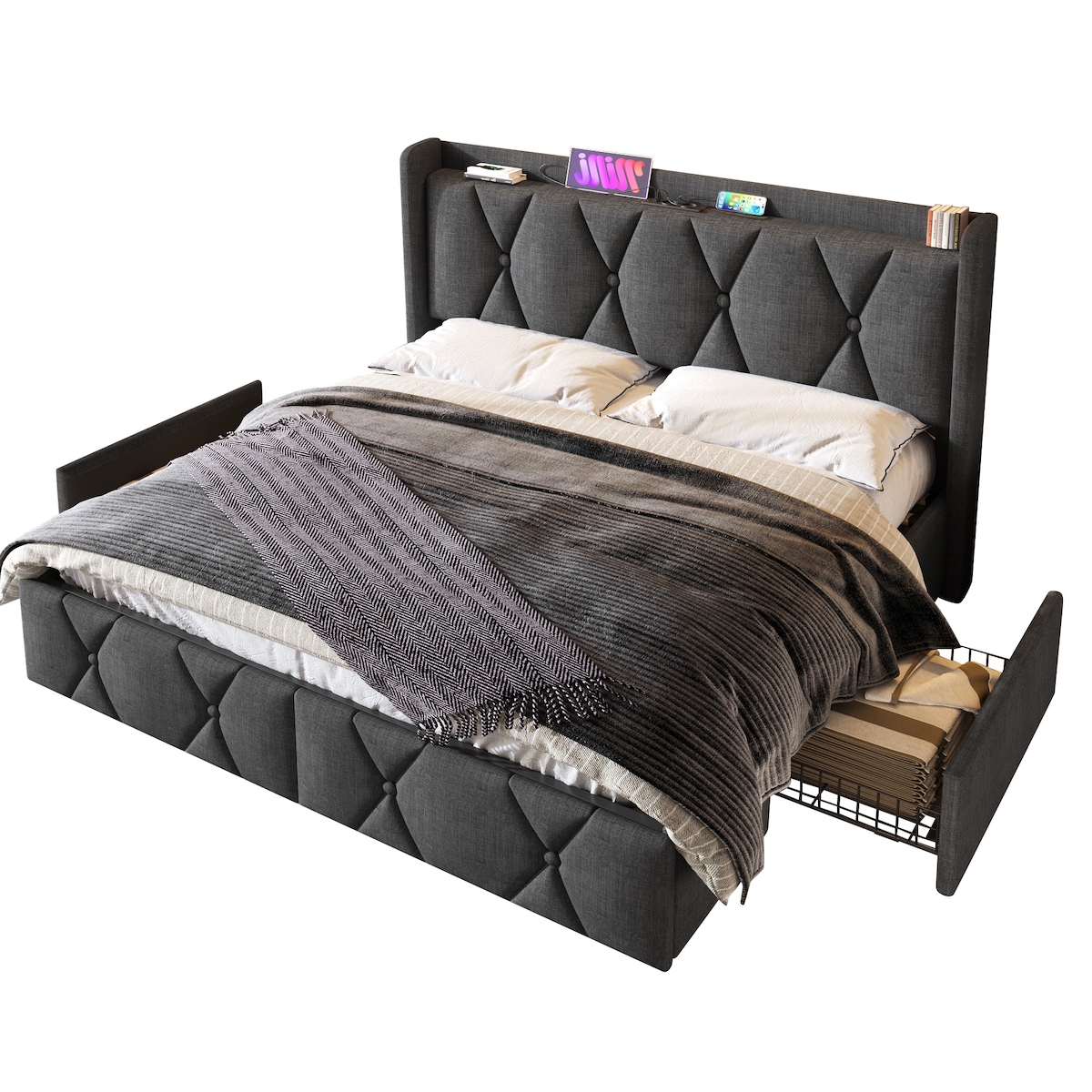 OKWISH Polsterbett Doppelbett 140 × 200 cm mit USB-Ladefunktion, 4 Schubladen, Kopfteil mit Steckdosen, Stauraumbett, Leinen, Grau