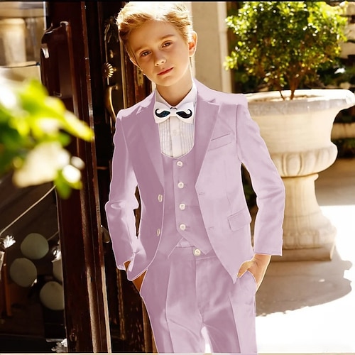 Completo da fedi per bambini, 5 pezzi, blazer pantaloni camicie cravatta ragazzo abito formale casual esterno festa moda fresco basic tinta unita tasca bottoni nero vino viola poliestere