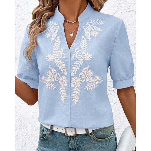 Per donna Camicia Blusa Floreale Elegante Etnico Moderno Manica Corta Scollo a V Top Regolari Quotidiano Ferie Uscire Ricamato Blu Nero Rosa Verde Albicocca Estate Primavera