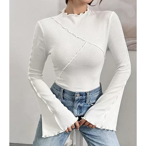 Per donna Top a maglia a coste Maglietta Top aderente Volant Cuciture a vista Tinta unica Elegante Manica Lunga Manica a campana Collo alto Top Regolari Uscire Weekend Bianco Primavera Autunno