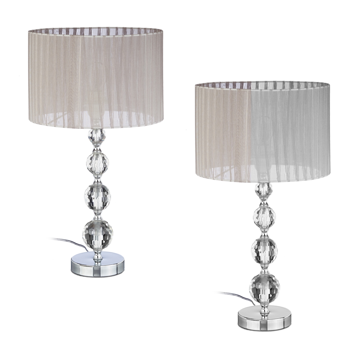 Relaxdays Tischlampe, 2er Set, Glasfuß, Stoffschirm, E27, HxD 53 x 29,5 cm, Nachttischlampe Kristalloptik, grau/silber