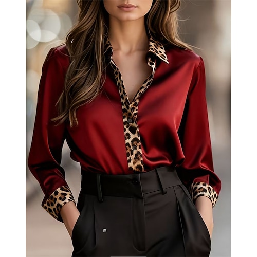 Per donna Camicia Elegant Raso/Satin Blusa Leopardo Semplice Elegante Vintage Signore Manica Lunga Colletto a Camicia Top Regolari Quotidiano Lavoro Ferie Arricciato Patchwork Bottoni Rosso Verde