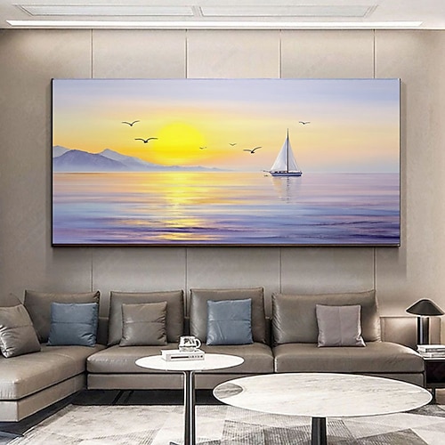 dipinto fatto a mano con splendido tramonto sul mare, arte murale viola e oro, arte murale naturalistica, grande dipinto di barca a vela sull'oceano, arredamento per la casa