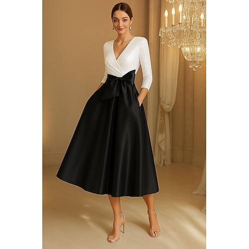 Linea ad A Lunghezza Tè Abiti da Cocktail Abiti da festa Elegante Manica 3/4 Scollo a V Festa in giardino Matrimonio Raso Elasticizzato Con Paillettes con Fiocco/Fiocchi