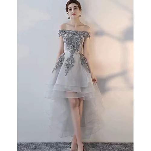 Linea ad A Asimmetrico Abiti da Ballo Floreale Alto Basso Manica Corta Senza Spalle Balli di fine anno Ospite di nozze Tulle con Applicazioni