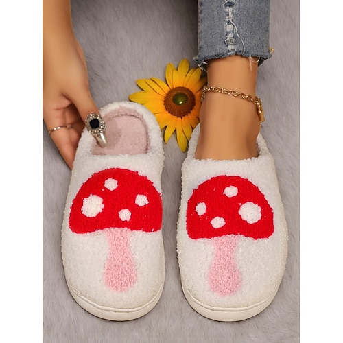 pantofole da donna nere e morbide con motivo a fungo rosso, pantofole di peluche per uso domestico e per il freddo