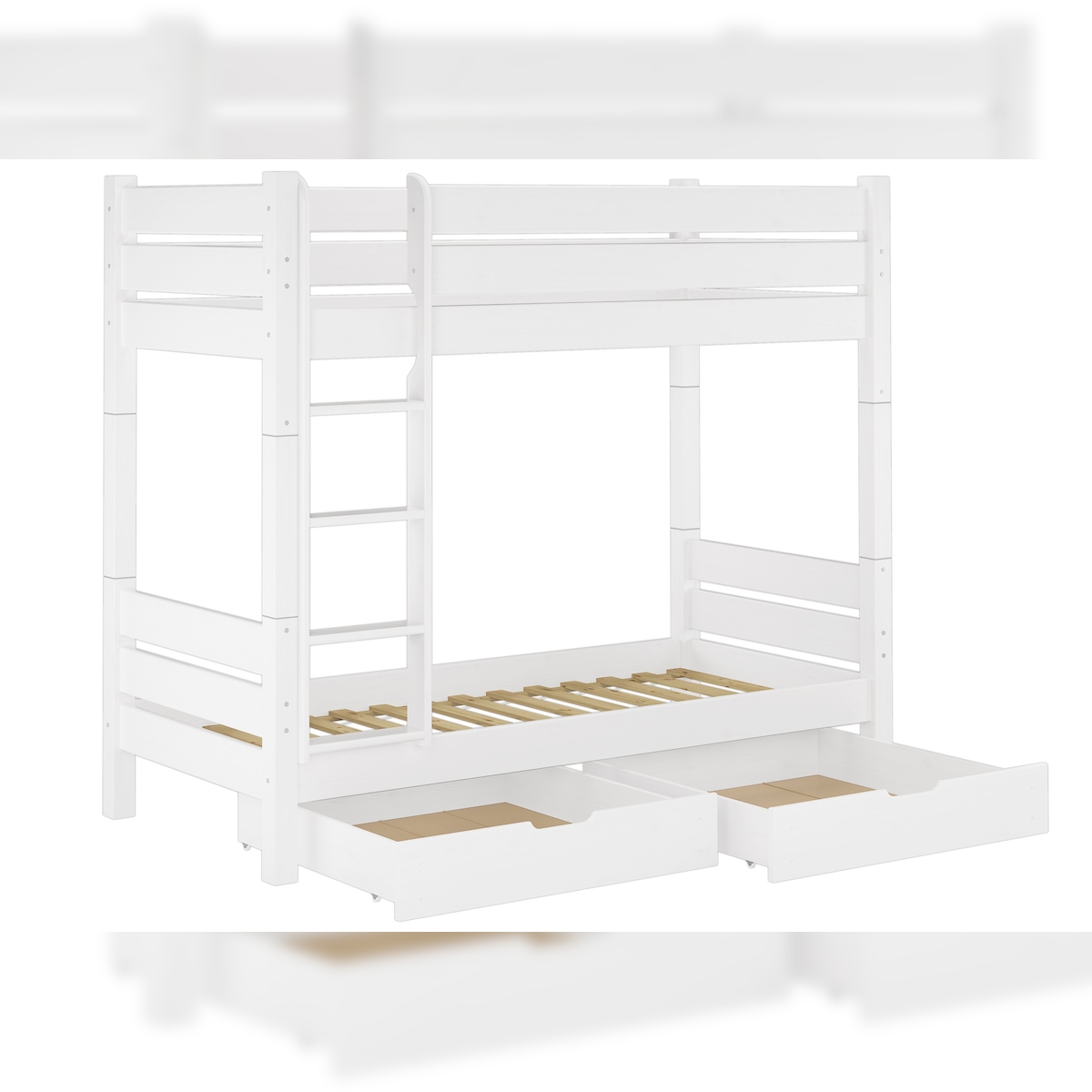 Erst-Holz Etagenbett für Erwachsene Kiefer weiß 100x200 teilbar 2 Rollroste Bettkästen 60.16-10WT100S2