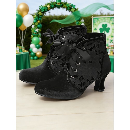 stivali da donna in velluto verde con lacci e dettagli in pizzo floreale: eleganti scarpe per il giorno di San Patrizio, design di ispirazione vintage per eventi festivi e celebrazioni delle festività