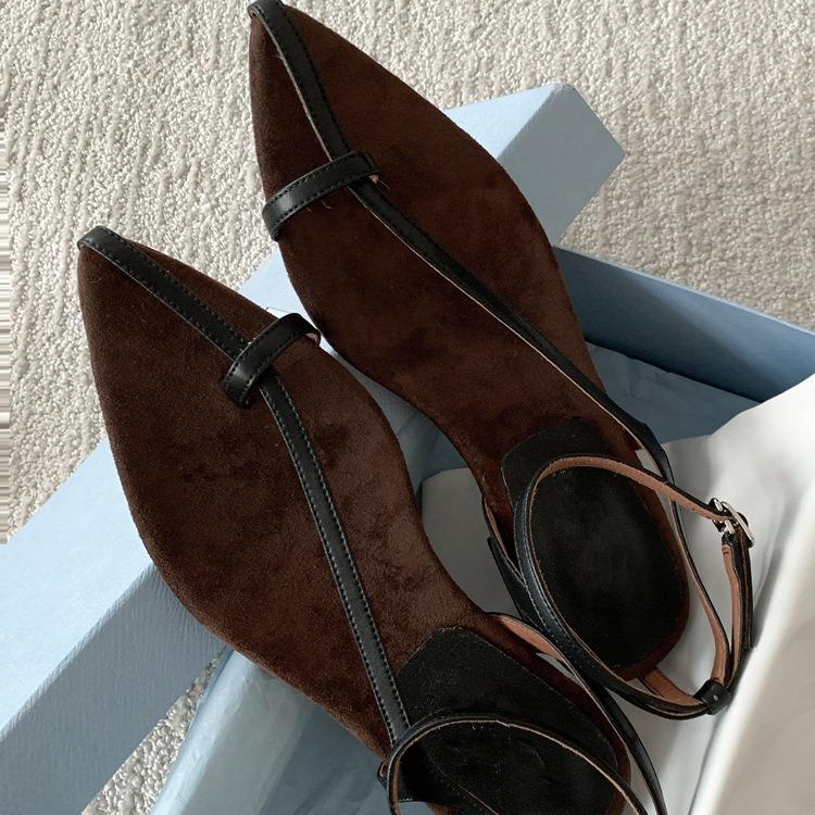 Leather French Niche Premium Sense Pointed Head Leaf Set Toe Sandals Women's Summer Vacation Low Heel Flat Heel Strap Sandals cm black